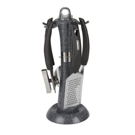 Set 4 ustensile de bucătărie din inox cu suport rotativ Tower T832031, design marmură și manere negre
