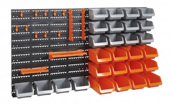 Panou de perete depozitare VonHaus 3515242 cu 28 sertare, organizare unelte, plastic rezistent, negru-portocaliu
