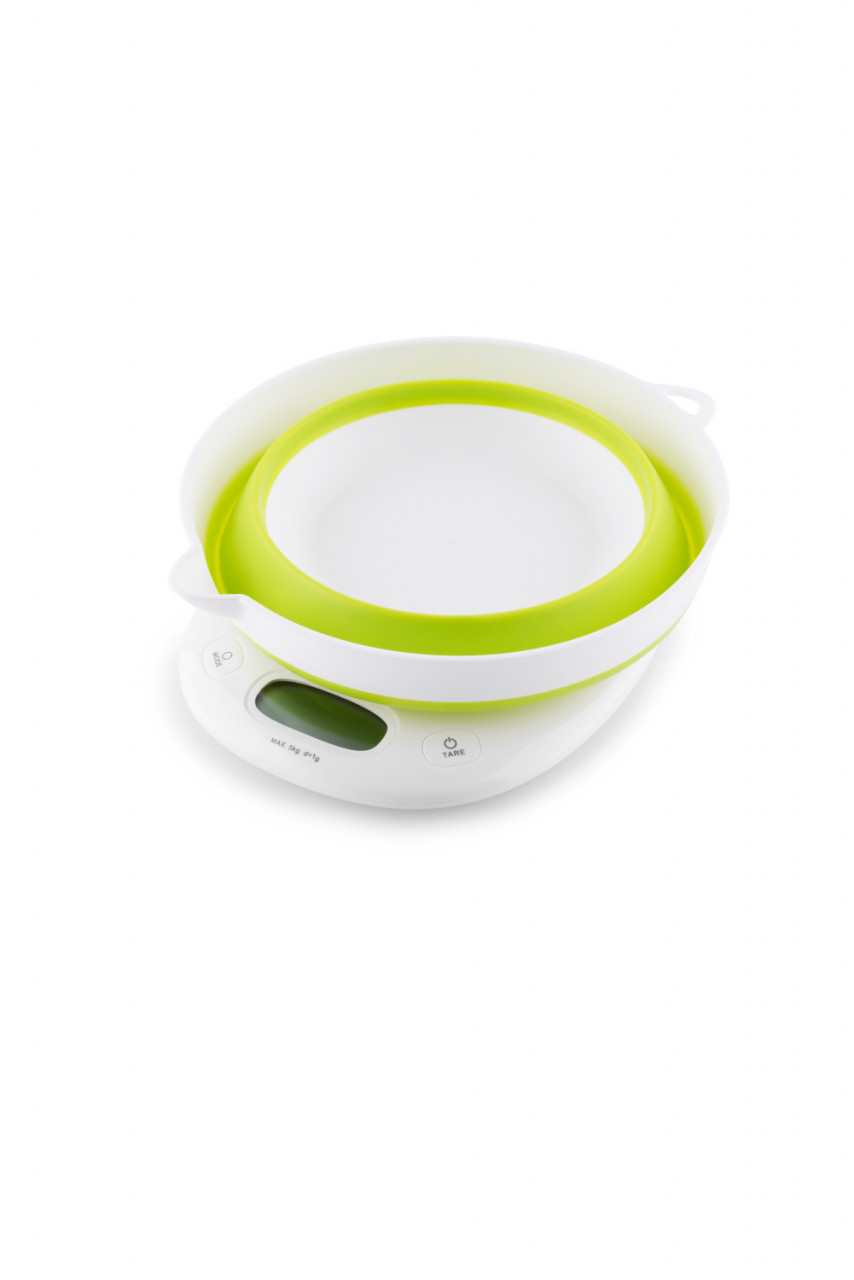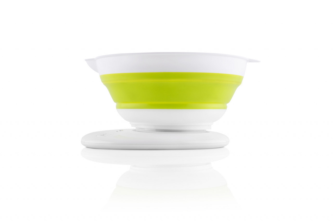 Produsul se livreaza impreuna cu un bol pliant cu volum de 1,5 litri , ceea ce va face mai usoara masurarea ingredientelor. Pe langa clasicele grame (g) si mililitrii (ml), puteti cantari si uncii (oz) si cupe (CUP).