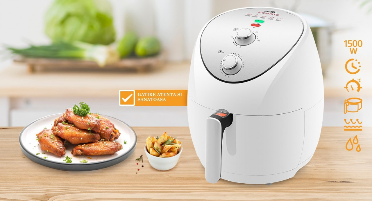 Friteuza cu aer cald are in interior un incalzitor si un ventilator. Datorita ventilatorului aerul incalzit la o temperatura de 80° C pana la 200° C este distribuit uniform in interiorul aparatului si prajeste alimentele. Mancarea este preparata uniform si nu se arde. Pentru mai multa siguranta, adaugati doar cateva picaturi de ulei. Fluxul de aer cald are doua mari avantaje: economisirea uleiului si prajirea mult mai sanatoasa. Se poate utiliza deasemenea pentru reincalzirea alimentelor, pentru coacere si gratar.