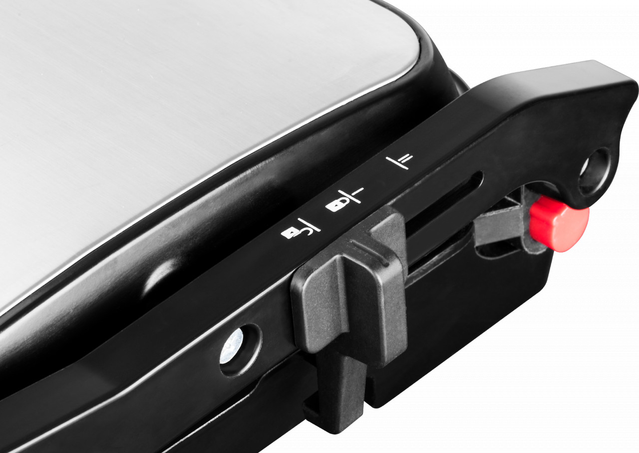 - Deschidere 180° – plăcile de grătar se deschid complet, dublând astfel suprafața de prăjire, ideală pentru mesele cu familia sau prietenii.