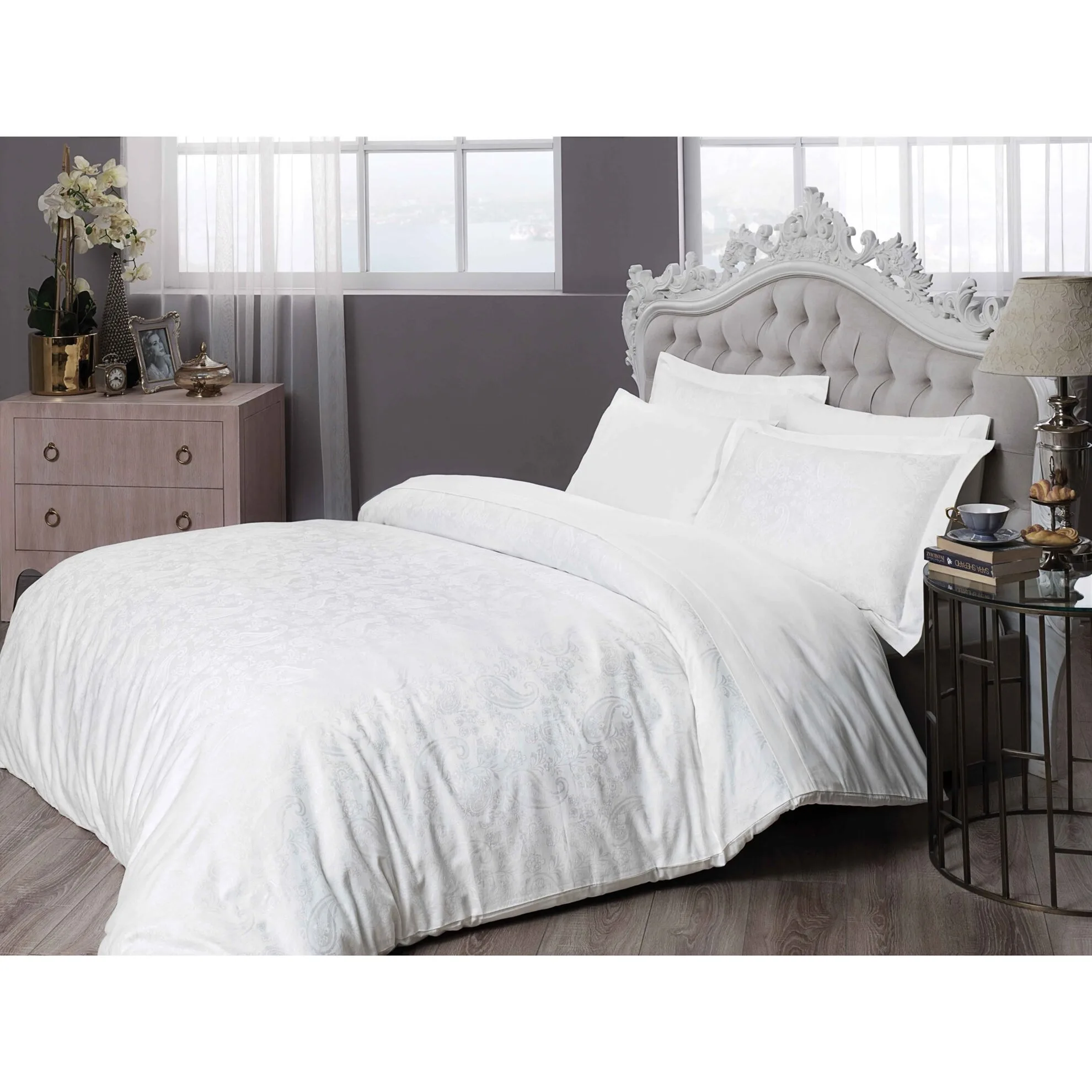 Lenjeria de pat este fabricata din 100% bumbac natural dublu mercelizat / satinat, tesatura jaquard. Aceasta este tratata antisifonare, are tesatura densa placuta la atingere cu un design modern. Ambalaj persoanlizat in cutie brad TAC, potrivit pentru un cadou elegant.