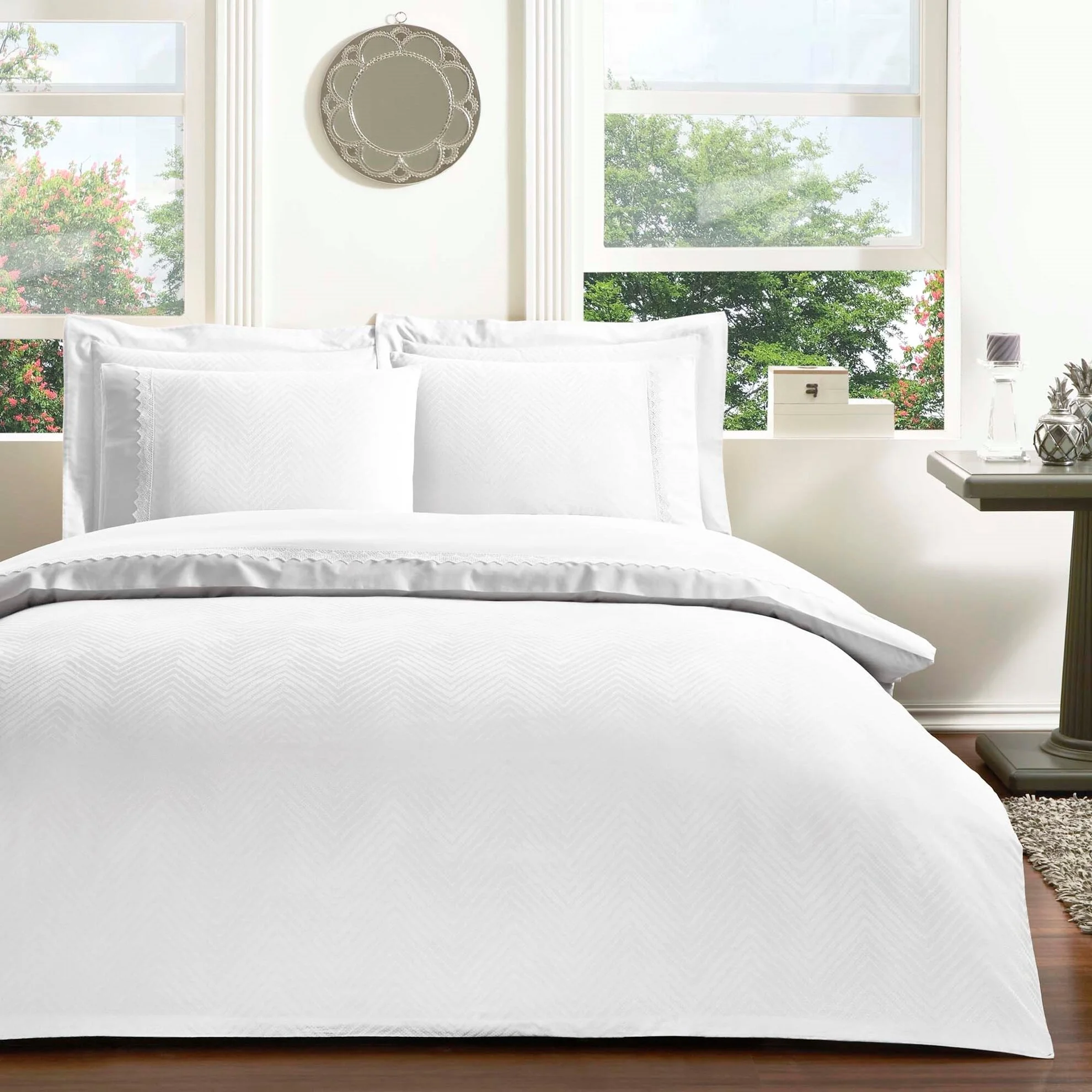 Lenjeria de pat este fabricata din 100% bumbac natural dublu mercelizat / satinat, tesatura jaquard. Aceasta este tratata antisifonare, are tesatura densa placuta la atingere cu un design modern. Ambalaj persoanlizat in cutie brad TAC, potrivit pentru un cadou elegant.