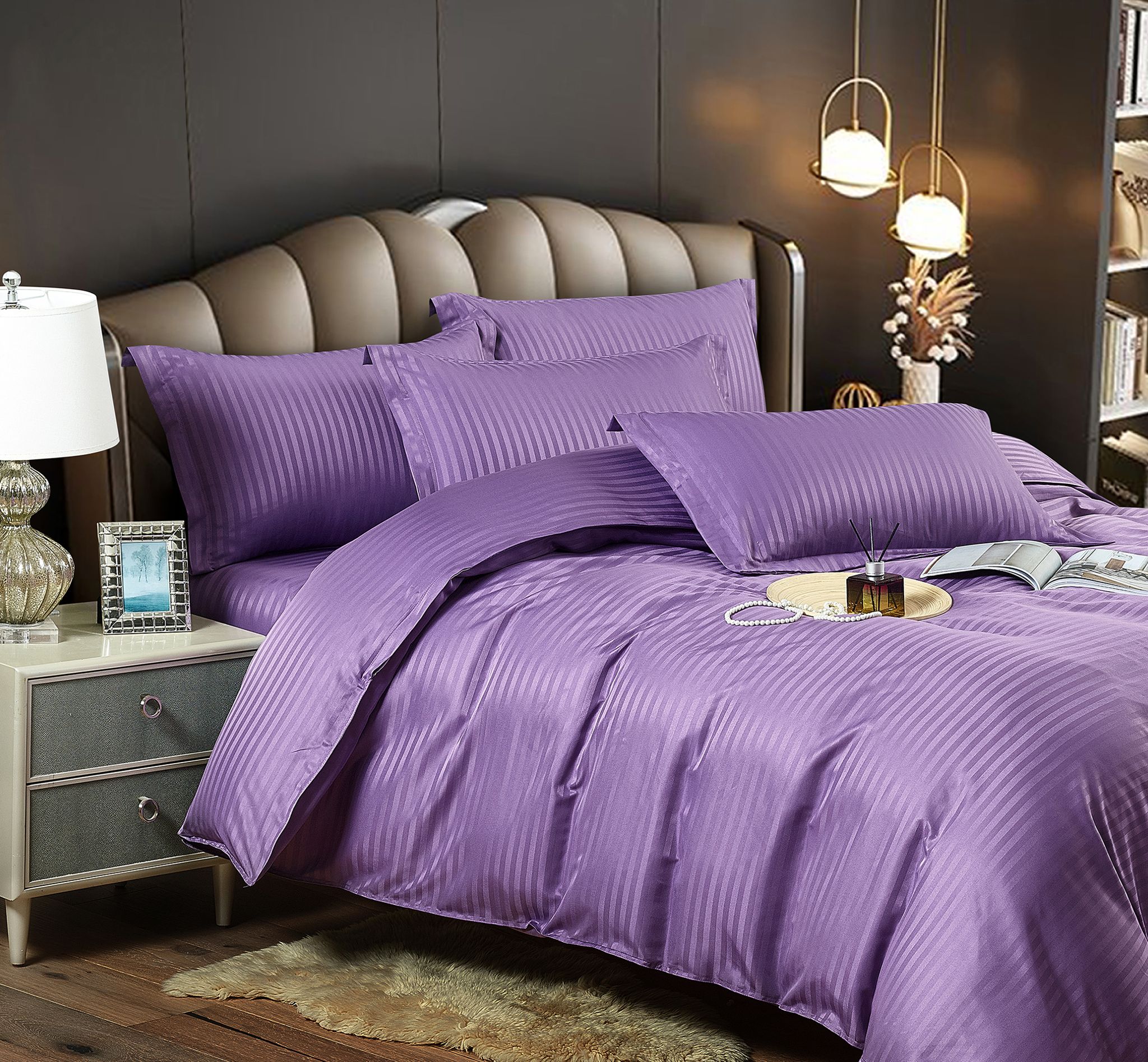 Bucurați-vă de confortul suprem cu lenjerie king size cu elastic Damasc Finet 6 piese Mov. Aceste lenjerii sunt concepute pentru a transforma dormitorul dvs. într-un sanctuar de rafinament și stil.