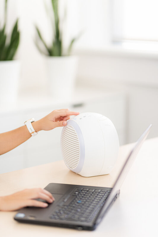 Puteti selecta una dintre cele trei viteze ale ventilatorului utilizand comenzile tactile. In plus, se poate schimba culoarea luminii de fundal in timpul functionarii. Folosind grila rotativa din fata, directionati fluxul de aer rece exact acolo unde aveti nevoie.