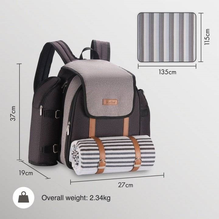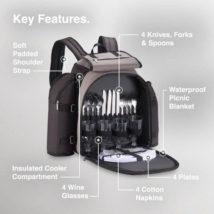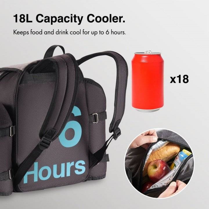 Este un rucsac portabil fabricat din fibre PEVA impermeabile, termoizolant si usor de transportat si cuprinde absolut tot necesarul pentru o calatorie sau un picnic reusit petrecut de patru persoane.