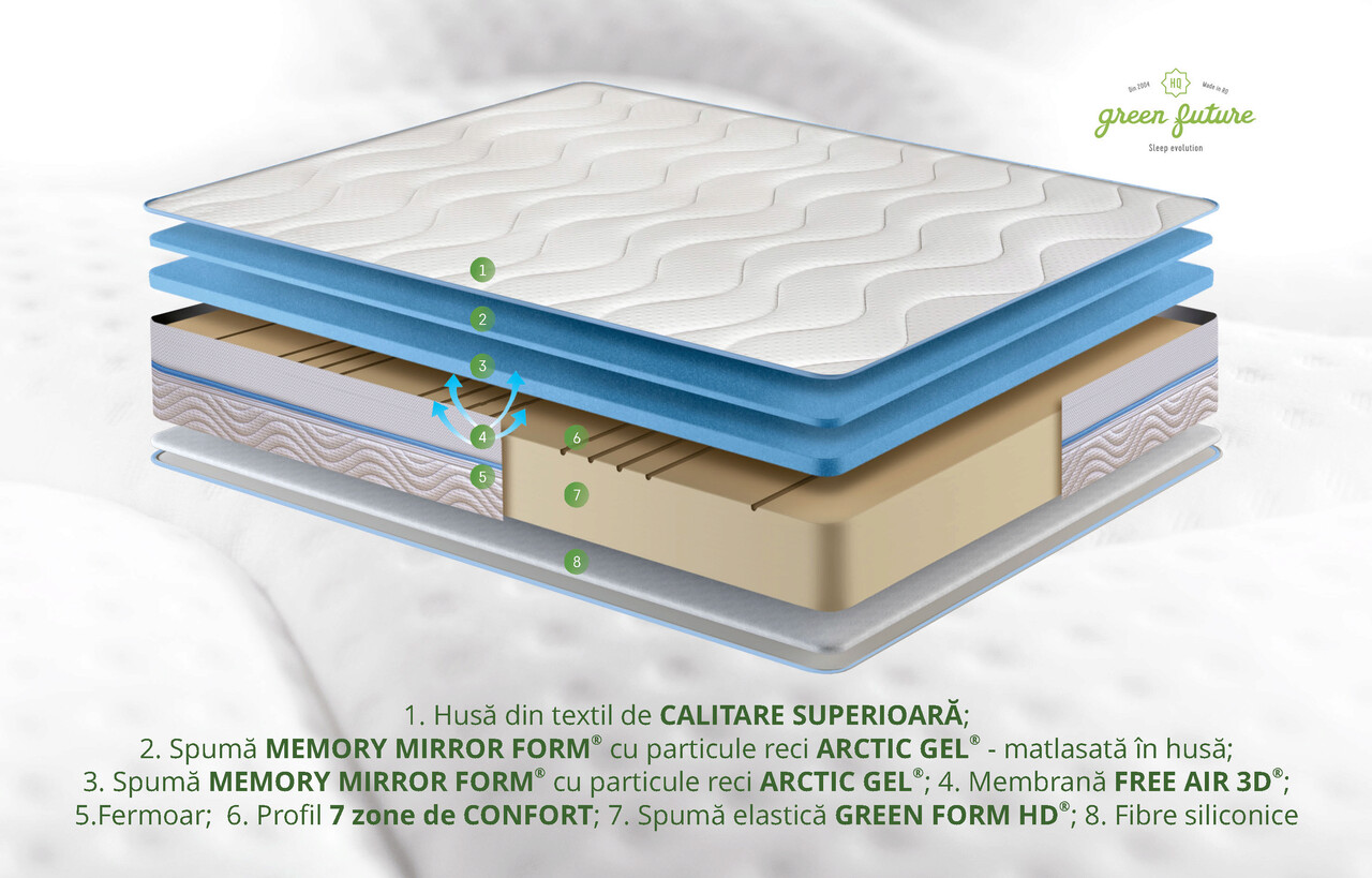 Dezvoltată în facilitățile de producție Green Future din România, salteaua Arctic Gel Memory 7 zone de Confort îmbină calitățile spumei elastice Green Form HD cu cele ale spumei Memory cu particule reci Arctic Gel, oferind un confort ortopedic și termic excelent.
