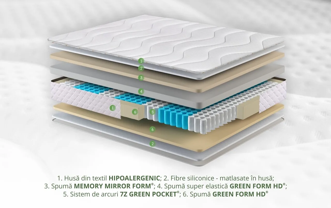 Tehnologia avansata a sistemului de Arcuri 7Z Green Pocket® impreuna cu cea a stratului de Green Therm Memory® asigura un somn fara propagarea miscarilor partenerului.