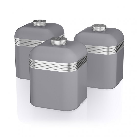 Fiecare cutie din acest set este realizată din metal de înaltă calitate, finisat într-o nuanță de gri sofisticat, care adaugă un accent de rafinament oricărui spațiu de bucătărie. Designul retro, cu linii curate și detalii clasice, este inspirat din estetica anilor 1930, perioadă în care Swan a lansat o serie de produse inovatoare care au revoluționat viețile de zi cu zi ale gospodinelor.