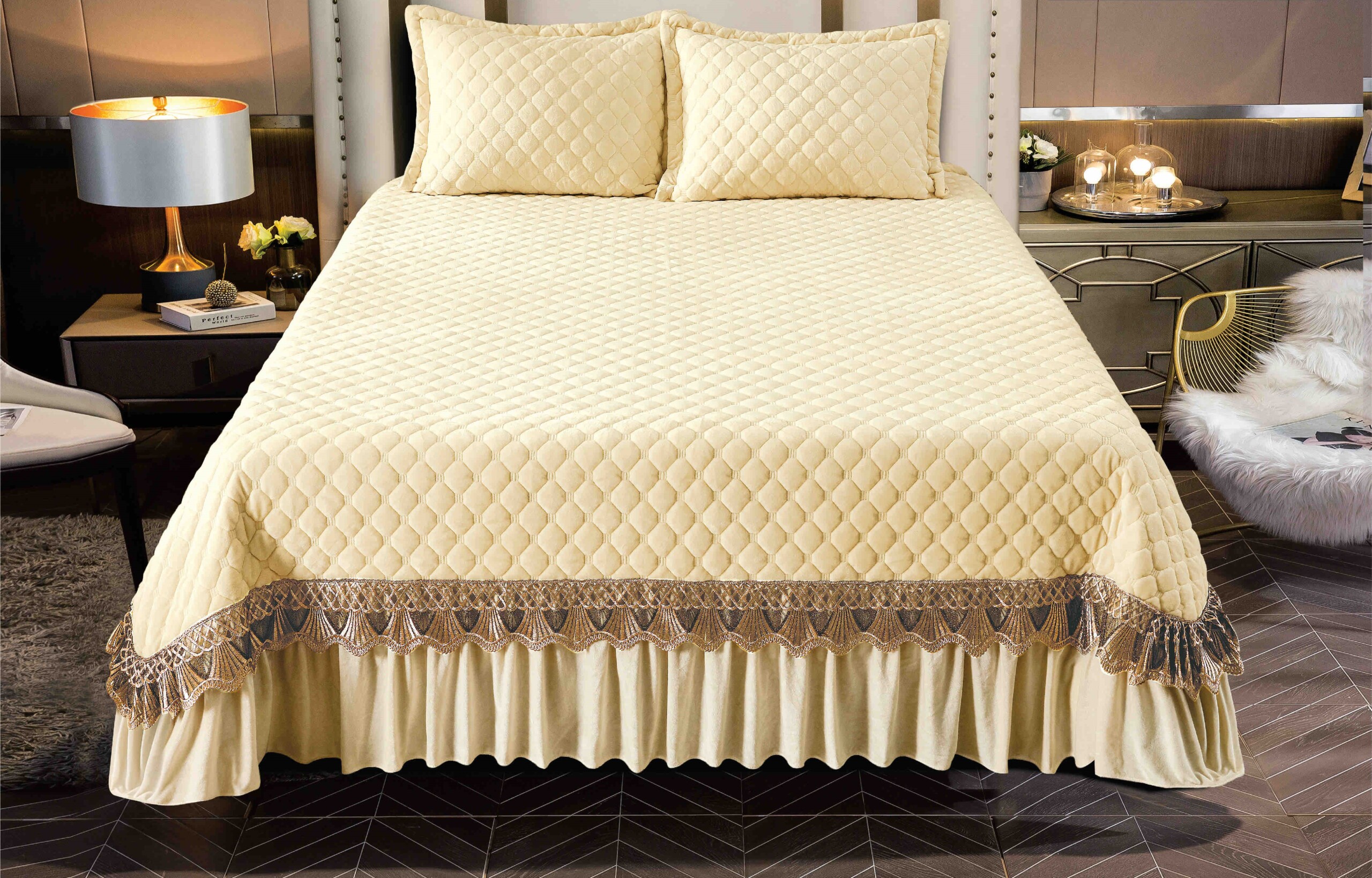Transformați-vă dormitorul într-un sanctuar al eleganței cu Setul de Cuvertură din Catifea 230x250cm, un produs de lux perfect pentru un pat de 2 persoane. Această cuvertură matlasată, cu volane delicate pe partea de jos, este accesorizată cu o broderie sofisticată, aducând un plus de rafinament oricărei camere.