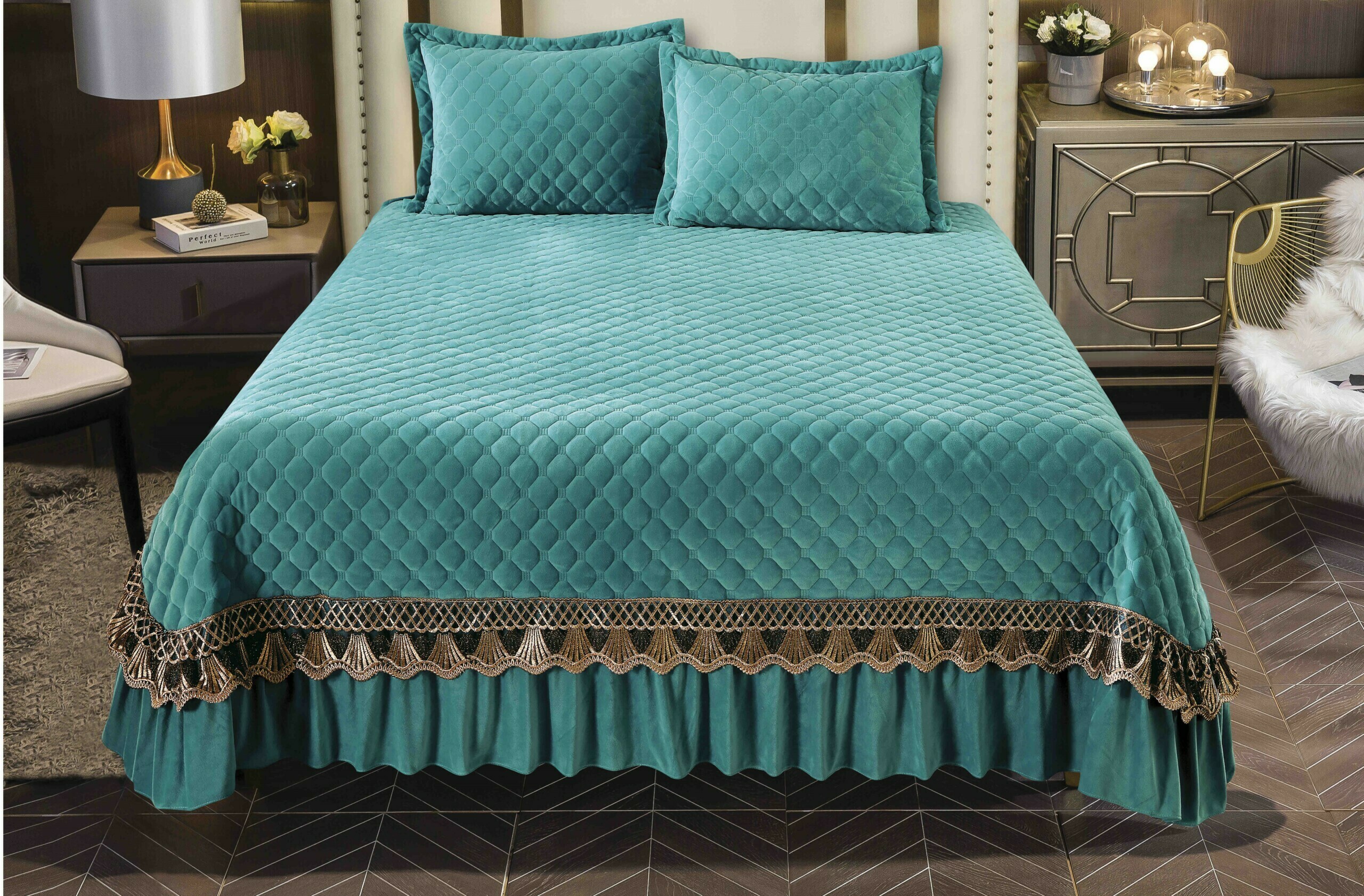 Transformați-vă dormitorul într-un sanctuar al eleganței cu Setul nostru de Cuvertură din catifea, special conceput pentru paturi de 2 persoane. Această cuvertură de lux, matlasată, este accesorizată cu volanase delicate și o broderie rafinată, oferind un aspect sofisticat și confortabil.