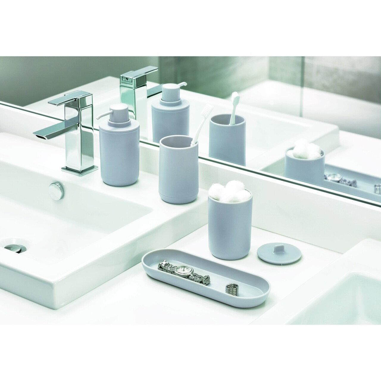 - 1 cutie cu capac cu dimensiunile D8 x 13 cm – ideală pentru depozitarea produselor cosmetice sau a accesoriilor de baie, menținându-le ascunse și protejate de praf.