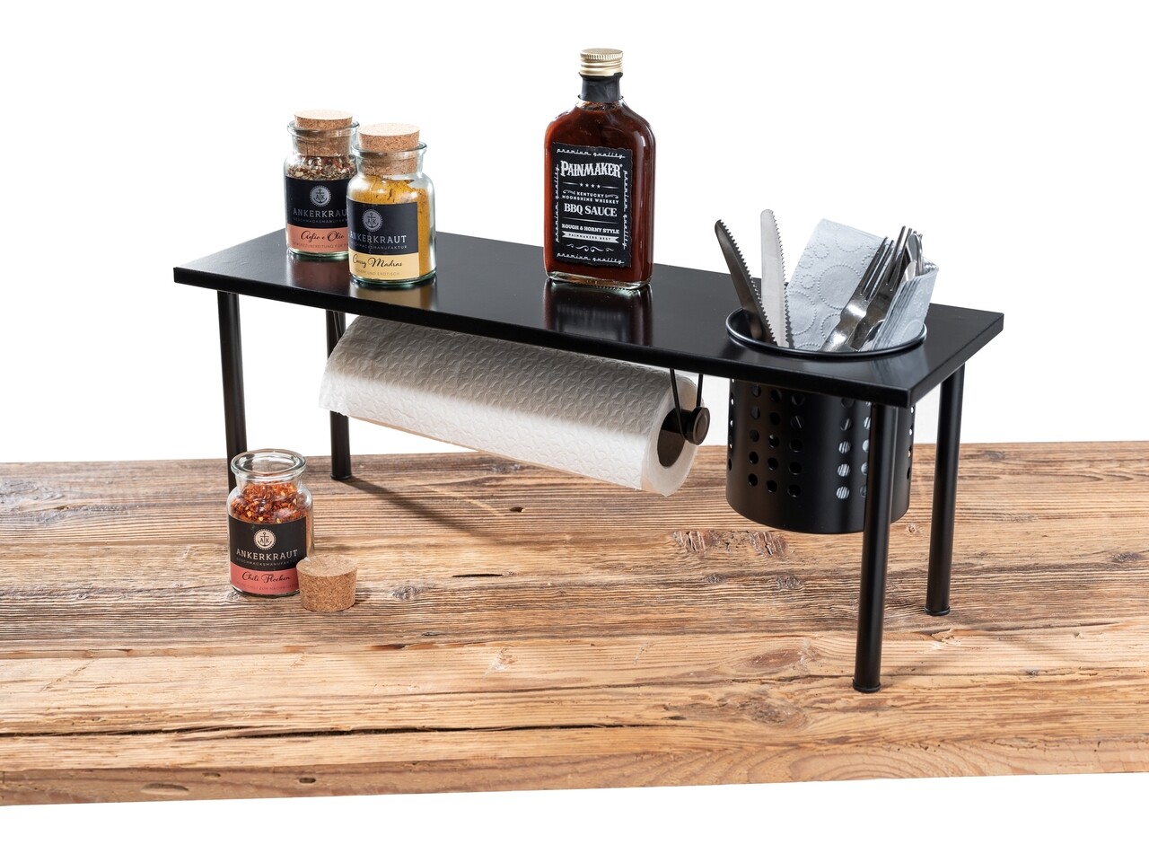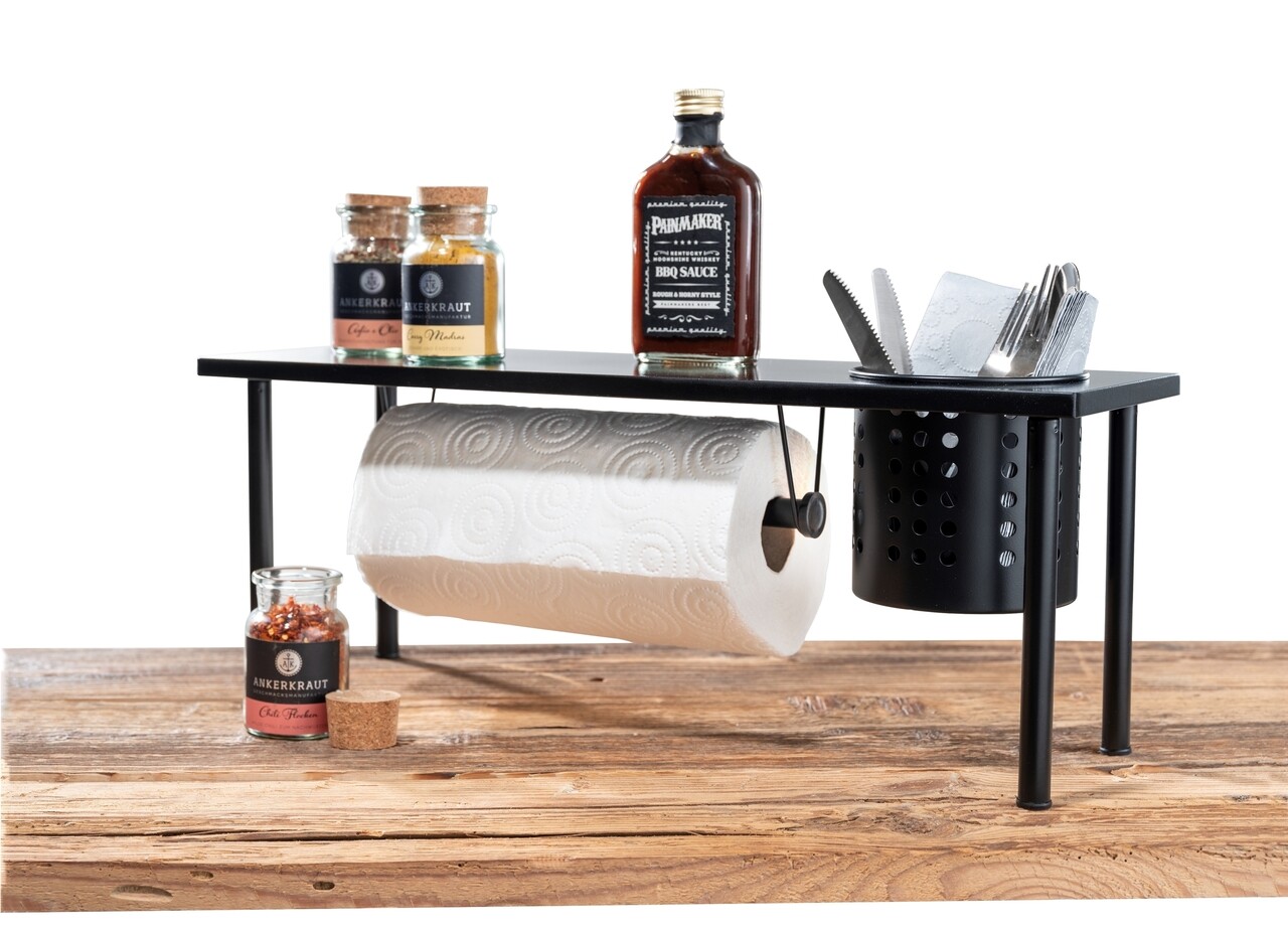 - Design Elegant: Fabricat din inox de calitate superioară și MDF, suportul are o finisare neagră, care se integrează perfect în orice decor de bucătărie.