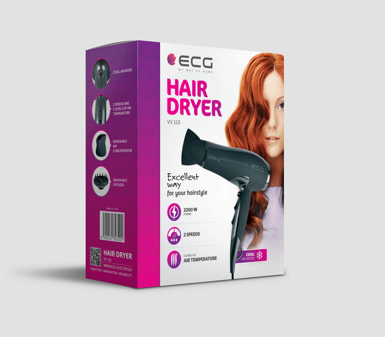 Uscătorul de păr ECG VV 115 este dotat cu o serie de caracteristici care îl fac indispensabil în rutina ta de îngrijire a părului: